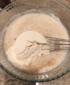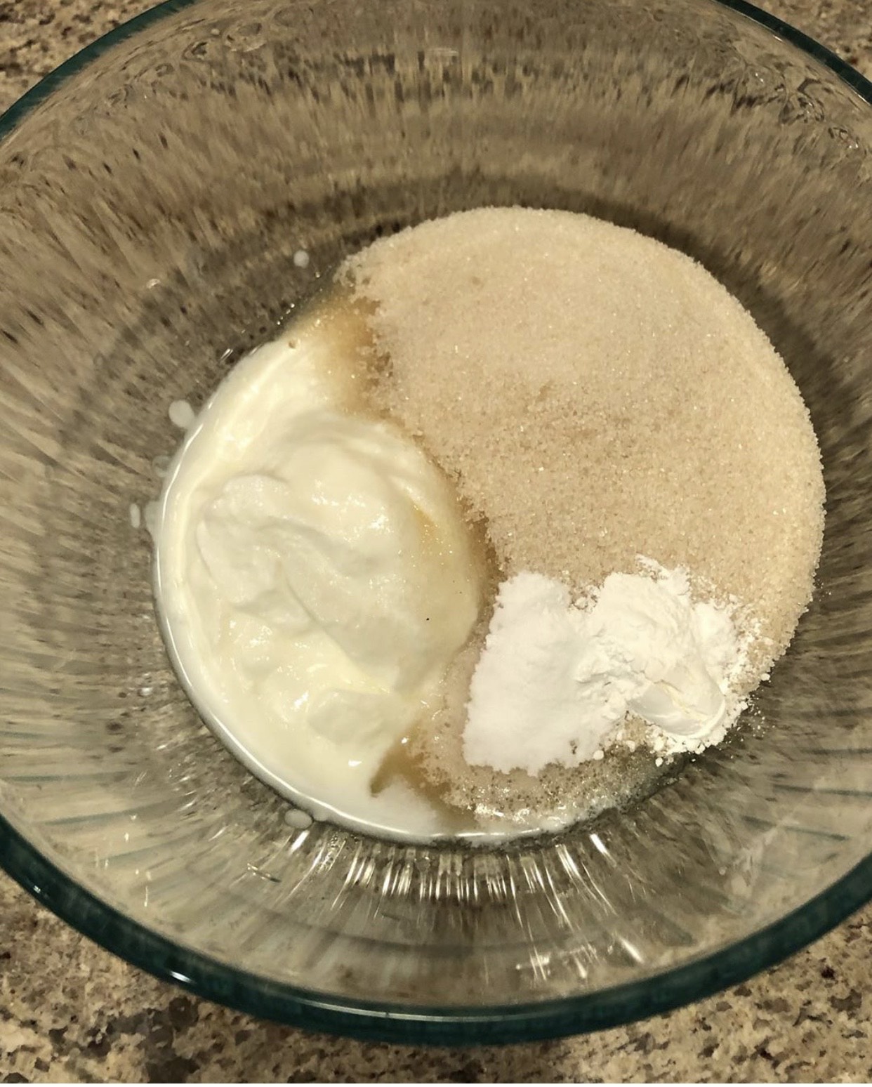 - In a large bowl, using a whisk, combine yoghurt with sugar, baking powder and baking soda. Set aside for 1 minute.