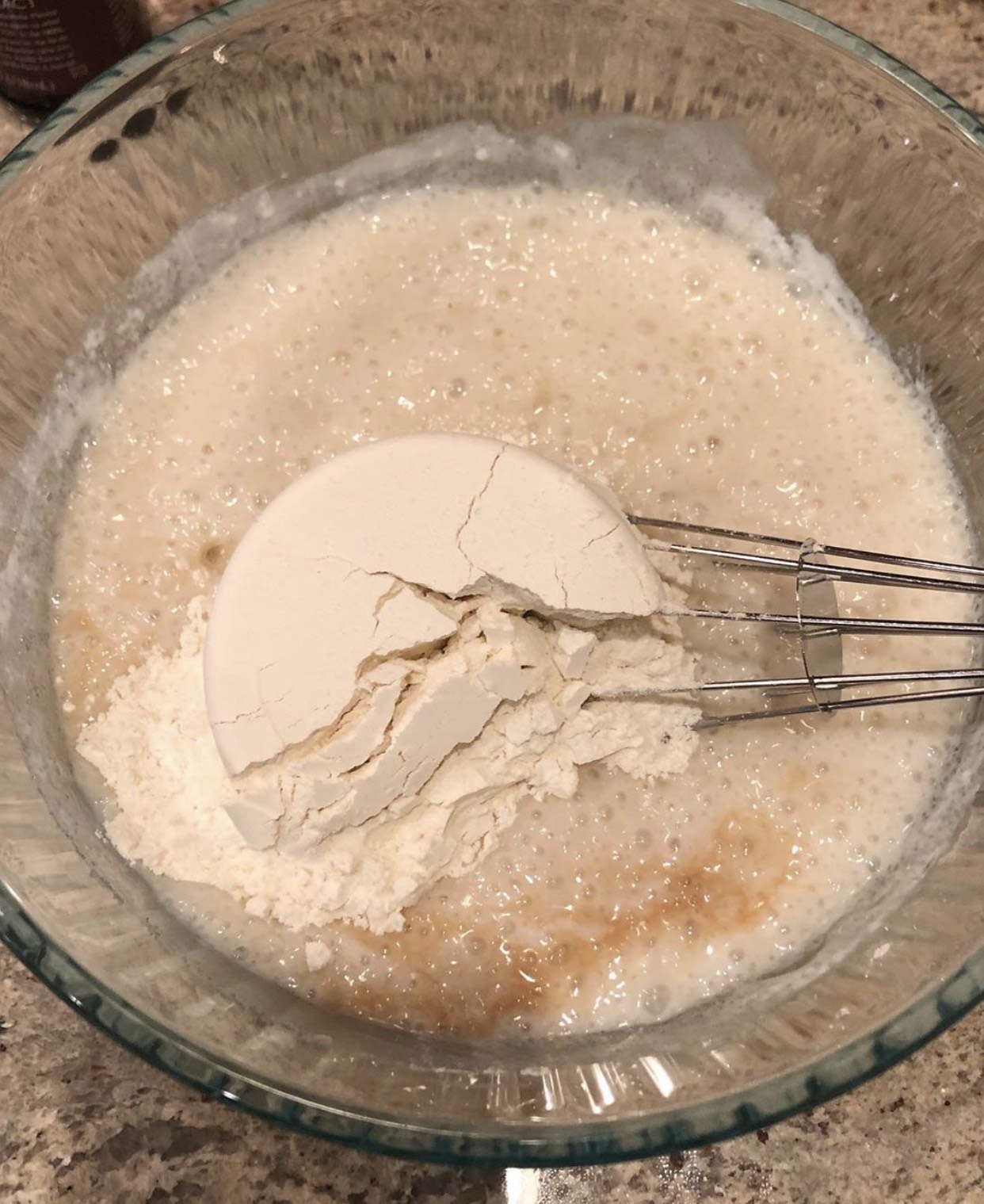 Alternately add the flour(sieve it while adding) and milk (3 tbsp) in small portions, starting and ending with flour, and whisk only till combined.