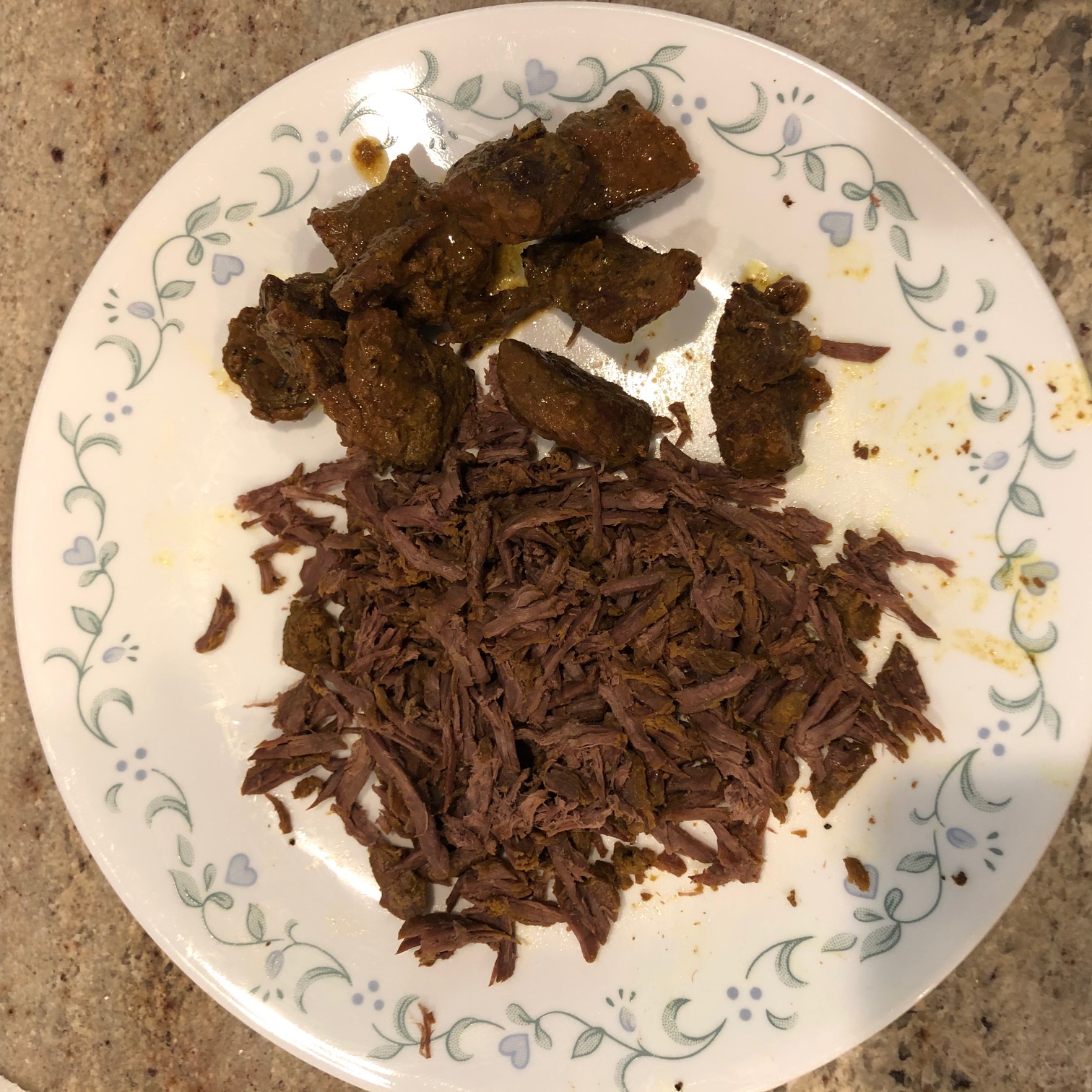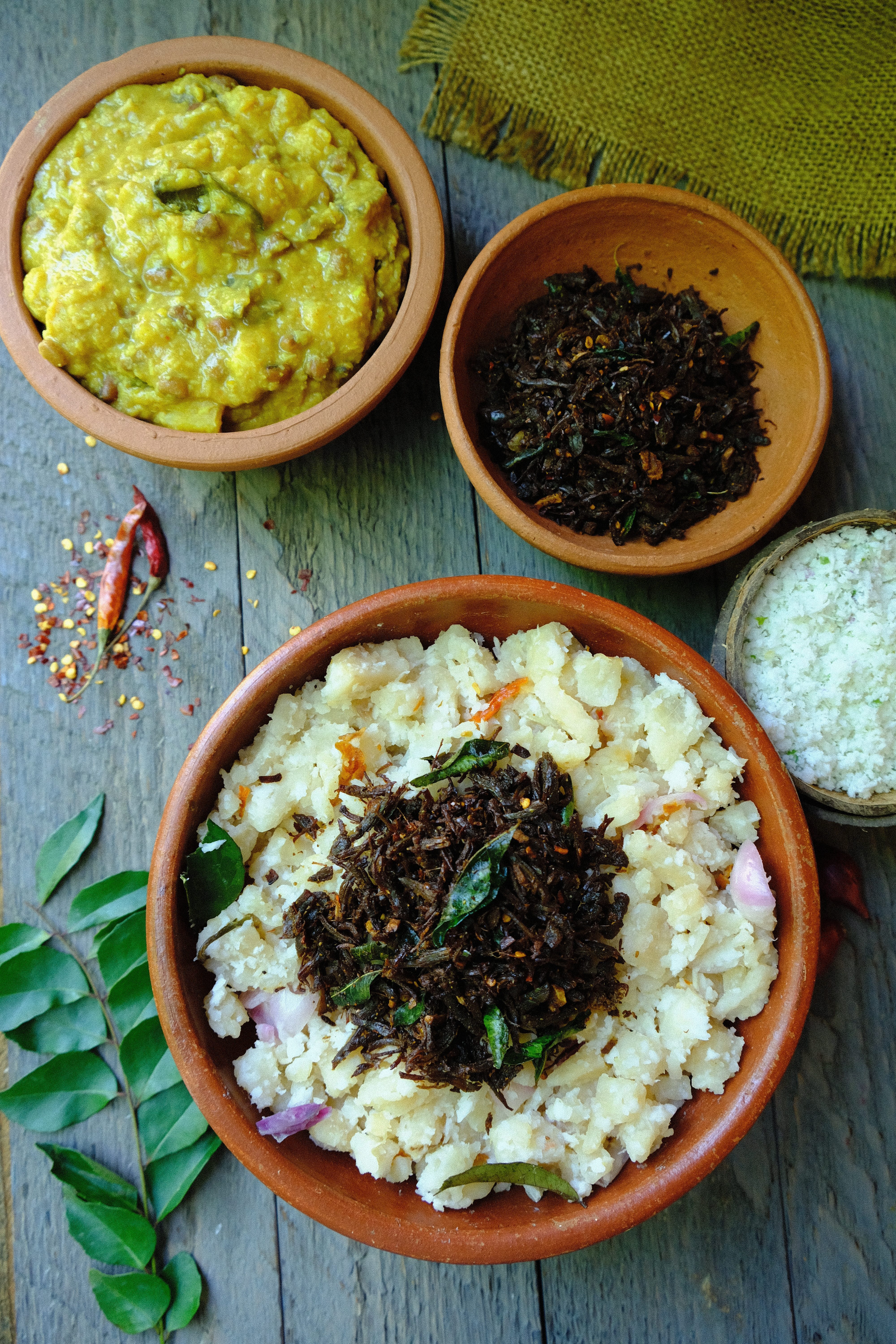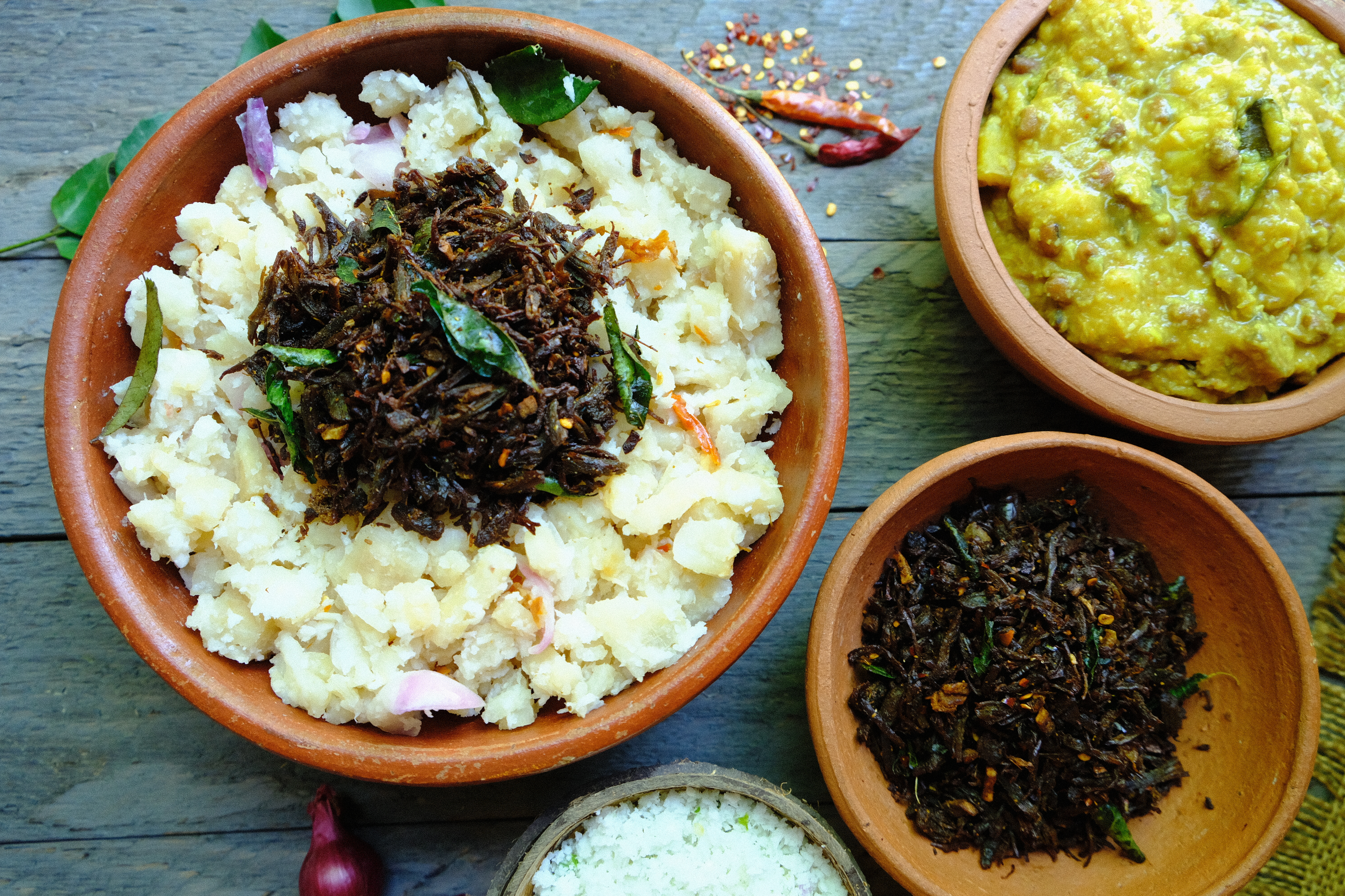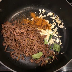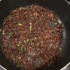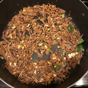 Sun-dried beef crushed/shredded and stirfried in coconut oil along with chilly flakes, ginger, garlic, meat masala powder and curry leaves until dry and crisp.