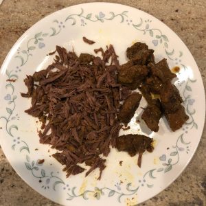 Cook beef pieces adding 1/4 tsp turmeric powder, 1/4 tsp pepper powder, 1/2 tsp chilly powder, 2 – 3 tbsp water and salt for 3 – 4 whistles or until done. Drain excess water. Set aside to cool. Shred into small pieces using your fingers.