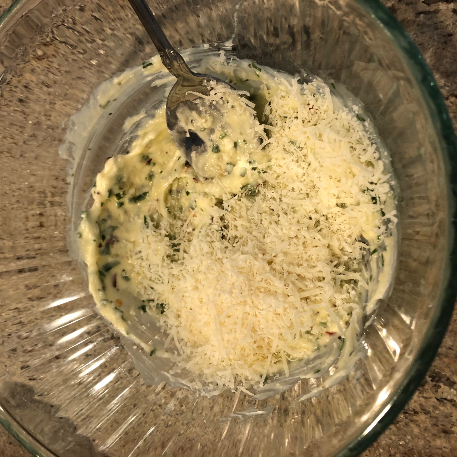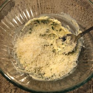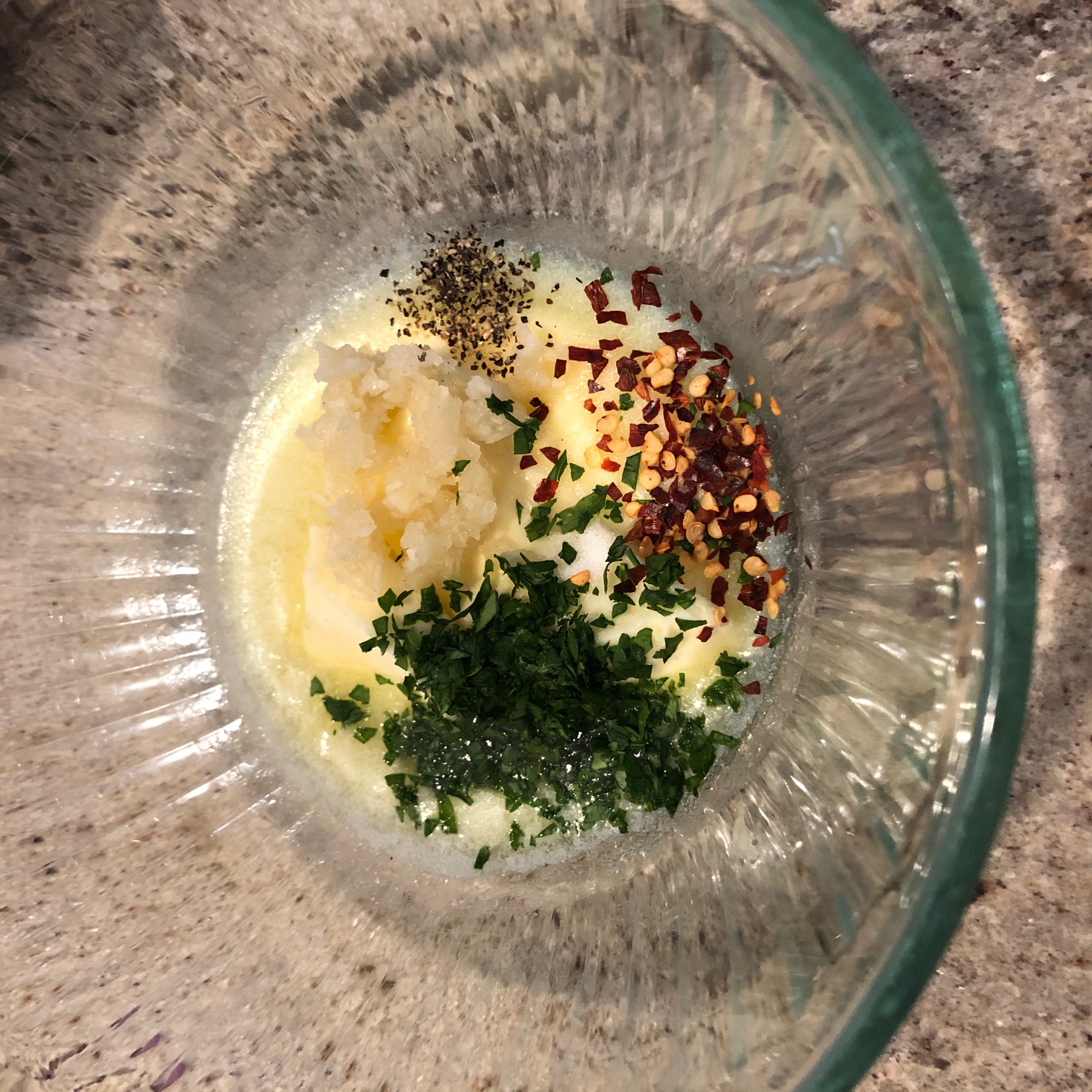 3. In a small bowl, combine the softened butter with garlic paste, parsley, crushed chili flakes, parmesan cheese, salt and pepper.
