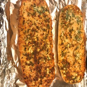4. Spread it on the cut side of the bread loaves. Broil at 400 F for 3 – 5 minutes until golden (or bake at 400 F for 7 – 8 mts). Keep an eye on the loaf as it broils! It can toast very quickly especially if the broiler is preheated. Slice and serve immediately!