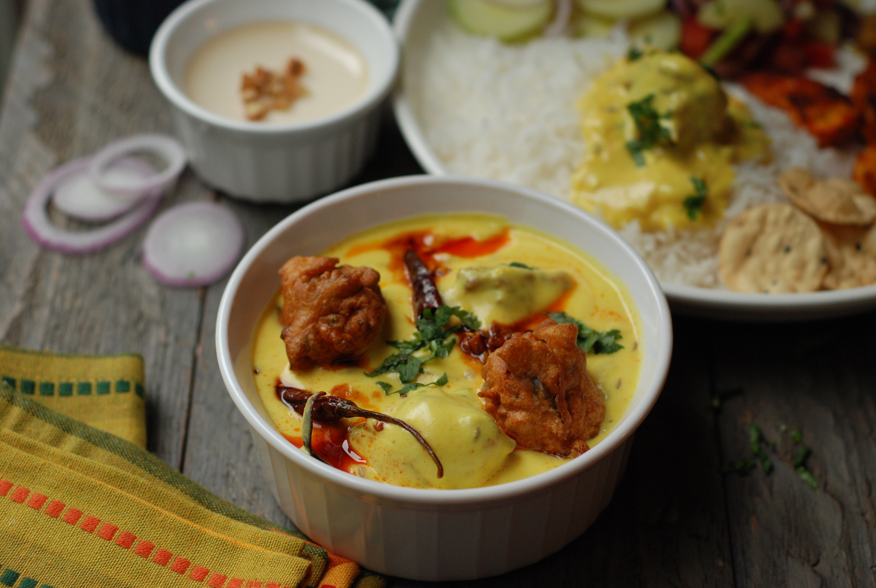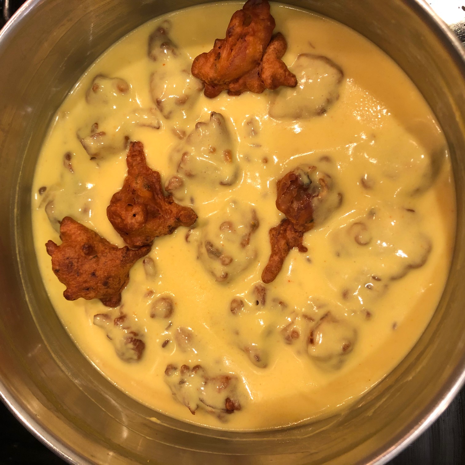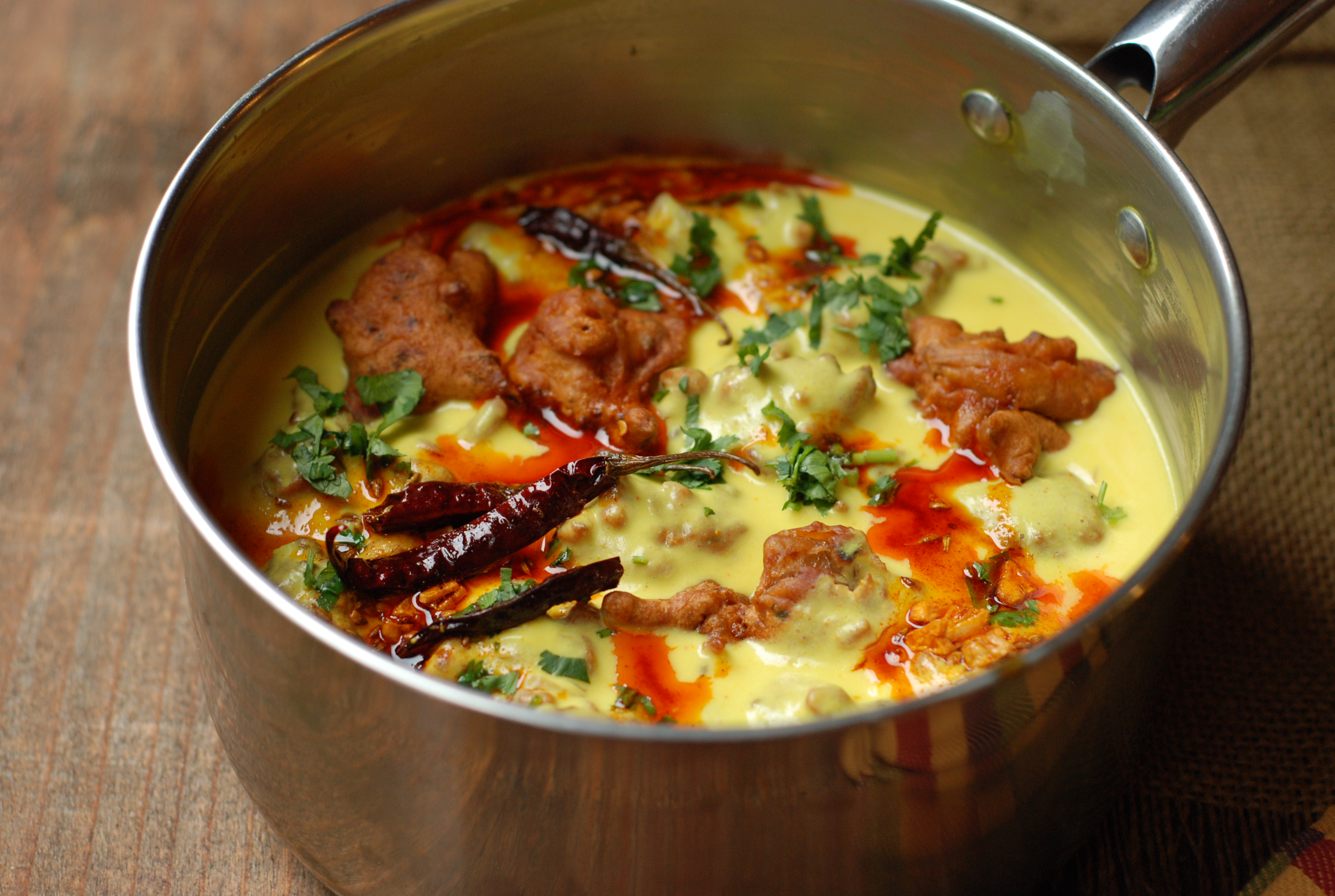 5. Add the fried pakoras to the kadhi. Mix well. Cook on low heat for two minutes and switch off.
