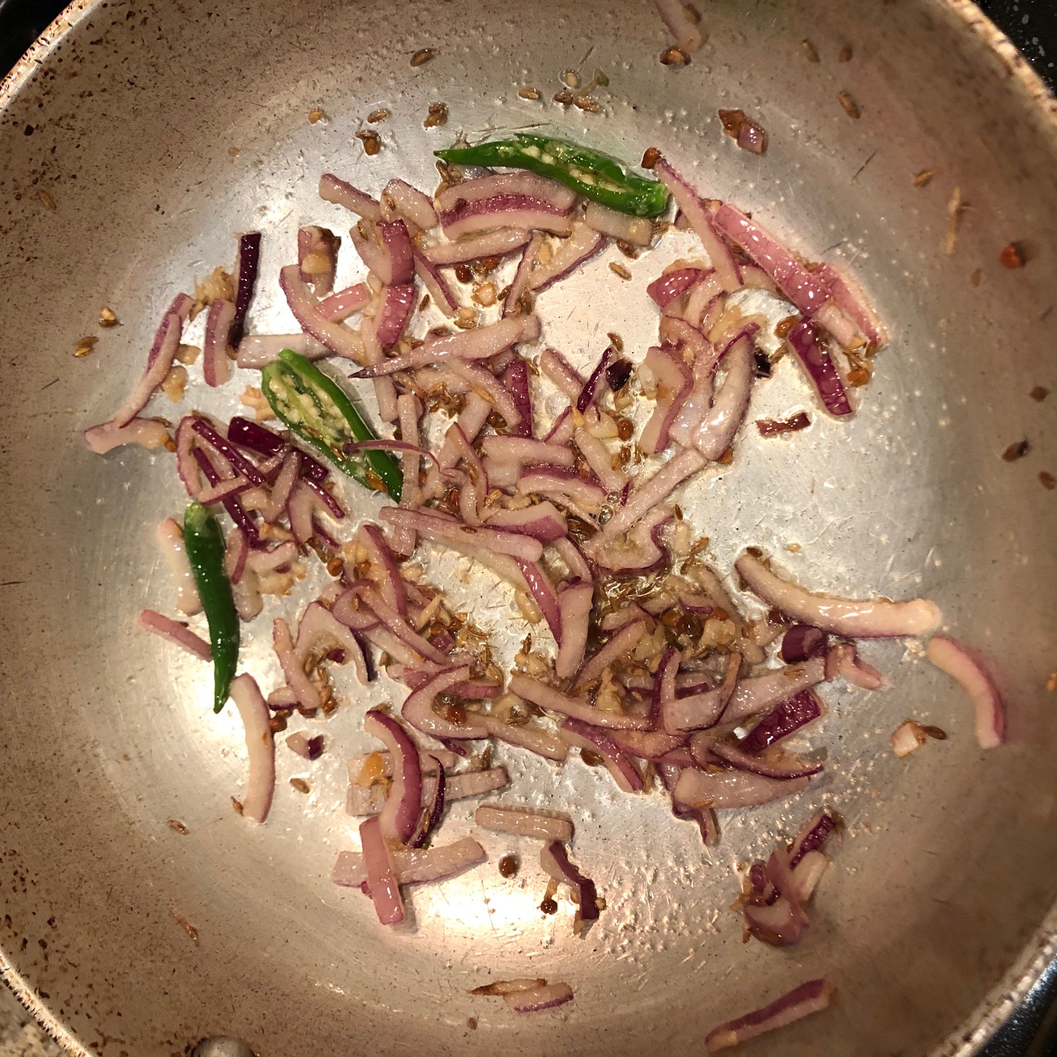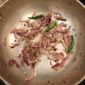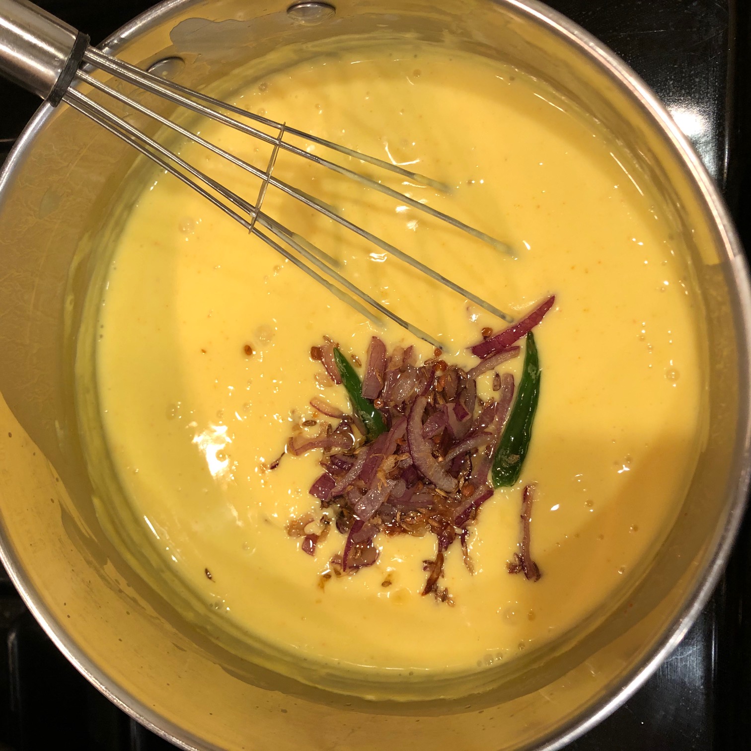 2. Heat oil in a large sauce pan and add 1/2 tsp cumin seeds and 1/4 tsp fenugreek seeds. Stir until fenugreek seeds turn reddish. Add onion, ginger and green chilies. Saute until onion turns soft. Add the whisked yoghurt and besan mix. Stir continuously and bring it to a boil over medium-high heat. Bring down the heat to low. Cook over low heat for 20 – 25 minutes, stirring in between, until thick. Add salt to taste and mix well.