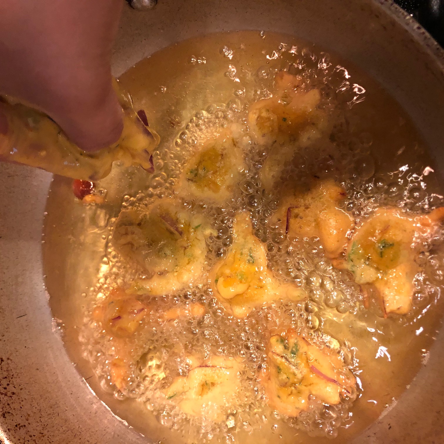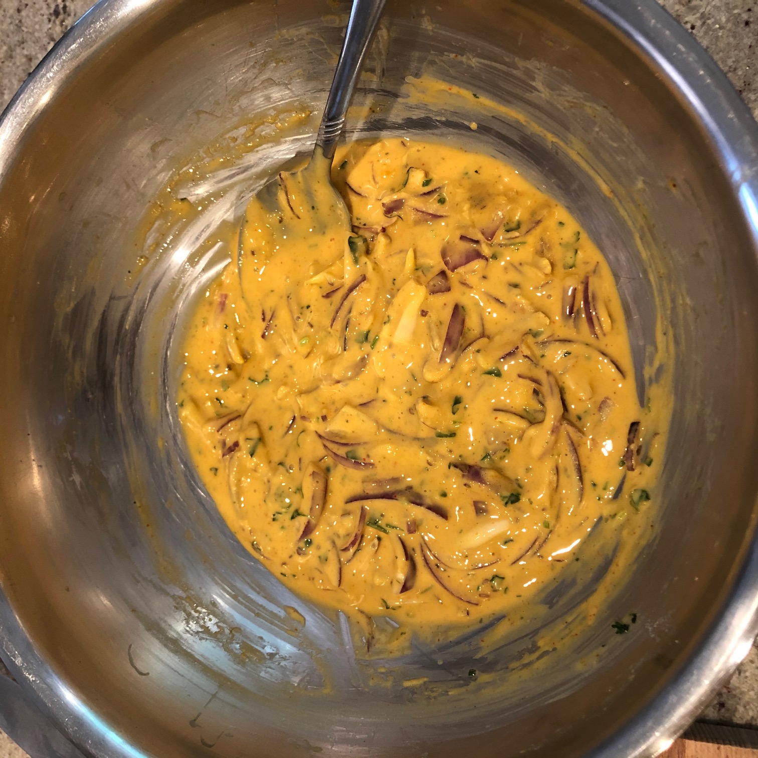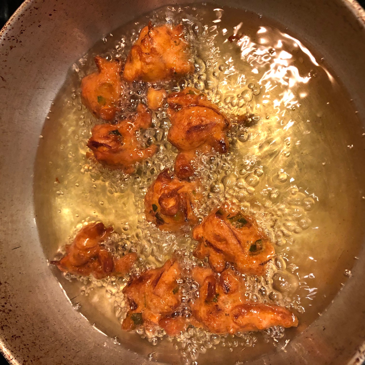 3. Meanwhile make pakoras. Combine all the ingredients numbered 3 with your fingers. Add 2 – 3 tbsp water to make a thick batter. Taste-check for salt. Add baking soda and mix well. Set aside for 5 minutes.