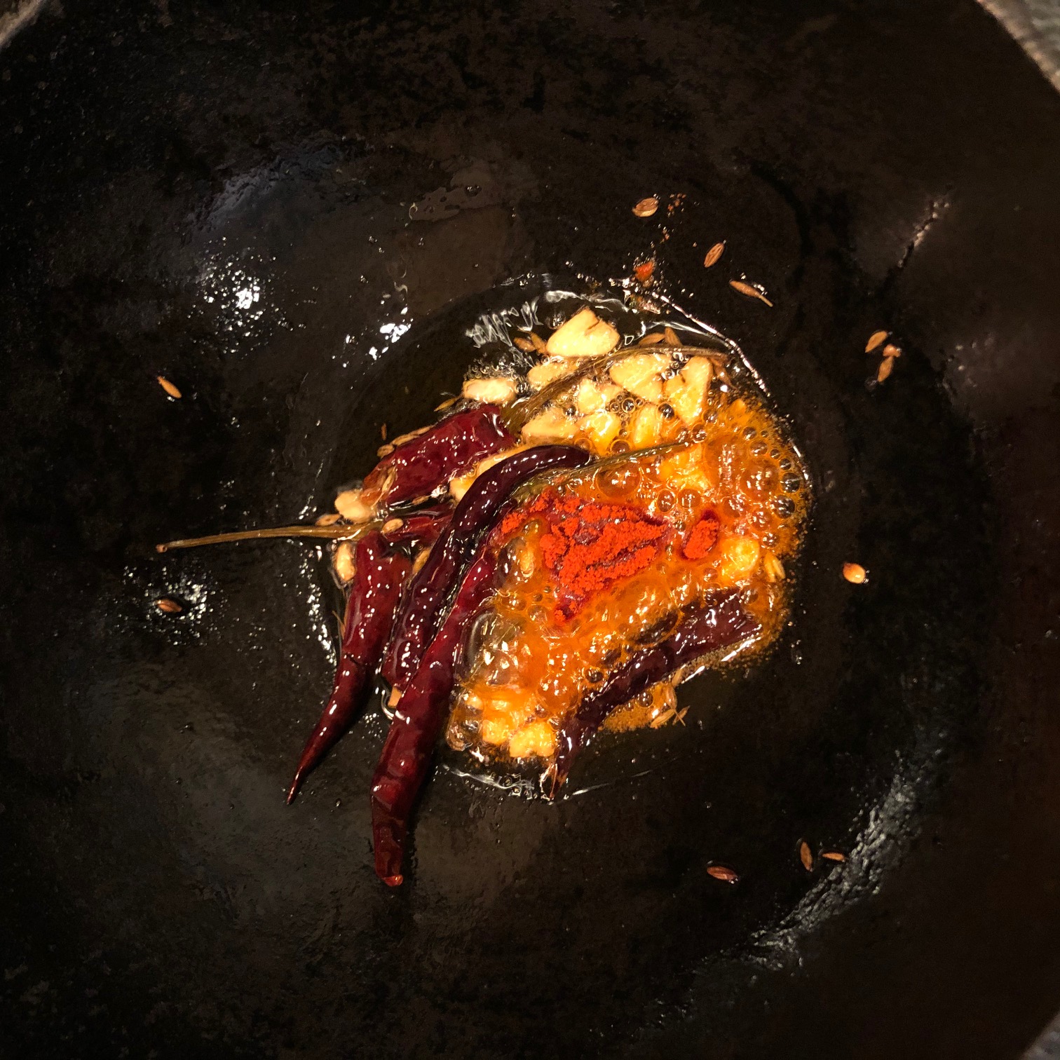 6. Heat 1 – 1.5 tbsp ghee in a small kadai over medium-high heat. Splutter cumin seeds and add a pinch of hing. Next add garlic and fry on low until light golden. Switch off the flame. Add 1/2 tsp kashmiri chilli powder, stir well and pour this over the gravy. Sprinkle cilantro. Keep covered for 10 minutes. Mix well. Serve with steamed rice, salad and pickle.