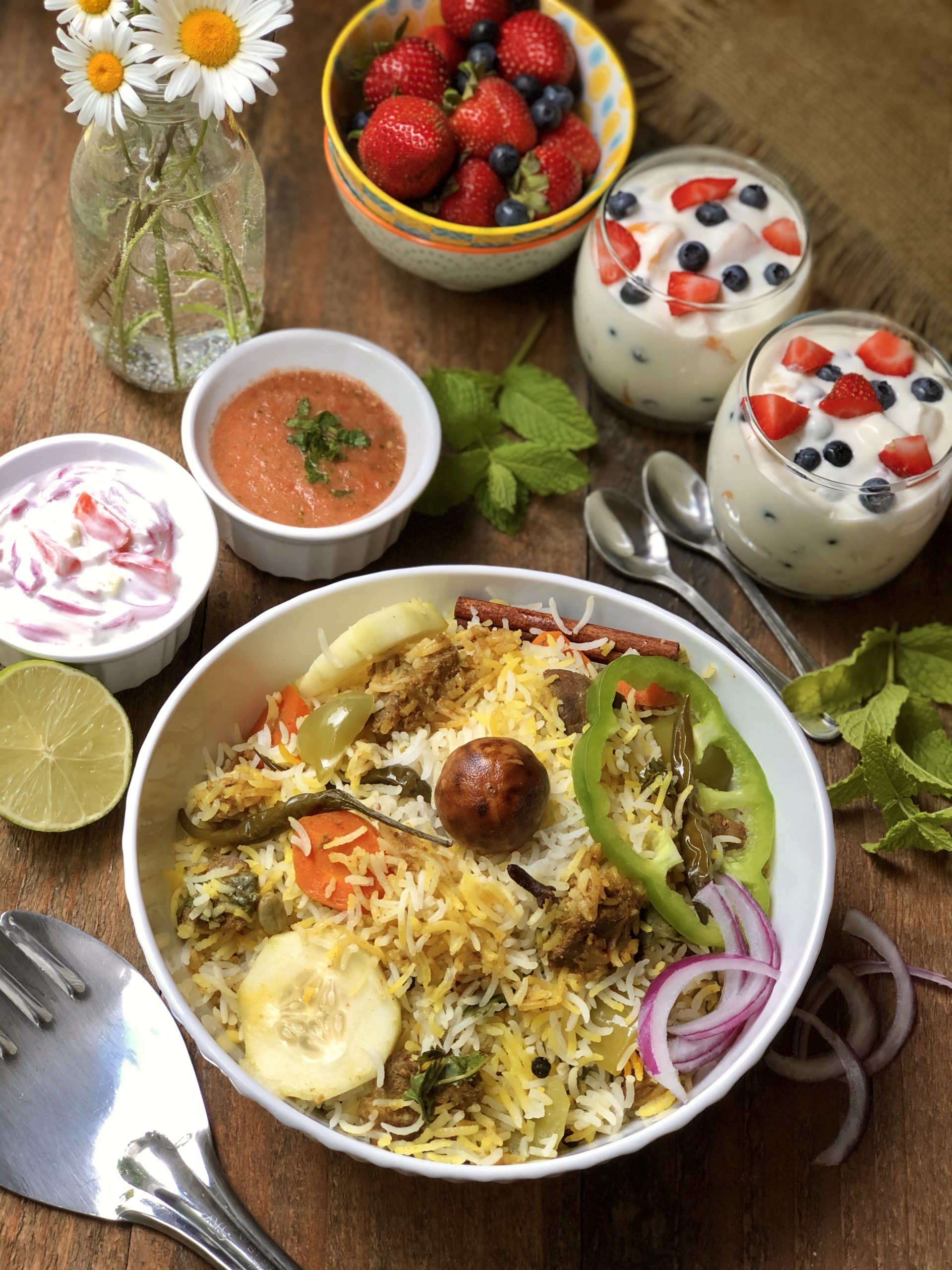 4. To layer – Spread 1 tsp ghee on the bottom of a heavy bottomed vessel. Top it with cooked beef. Spread hot cooked rice on top. Sprinkle chopped cilantro, melted butter, a littke kabsa masala, saffron water and cucumber pieces (optional).  For smoky flavor – Heat a charcoal over flame. Place it inside a small steel bowl set inside the pot and pour a tsp of ghee over it. Immediately cover the pan with an aluminium foil. Cover with a lid and bake it at 350 F for around 8 mts (depending on the cookware you use). If you are using stove-top, keep it on a tawa over low flame for around 8 – 10 mts. Set aside for 15 minutes. Beef Kabaliyath is ready to serve! Serve with raita or salata haara (recipe below).  Enjoy!!