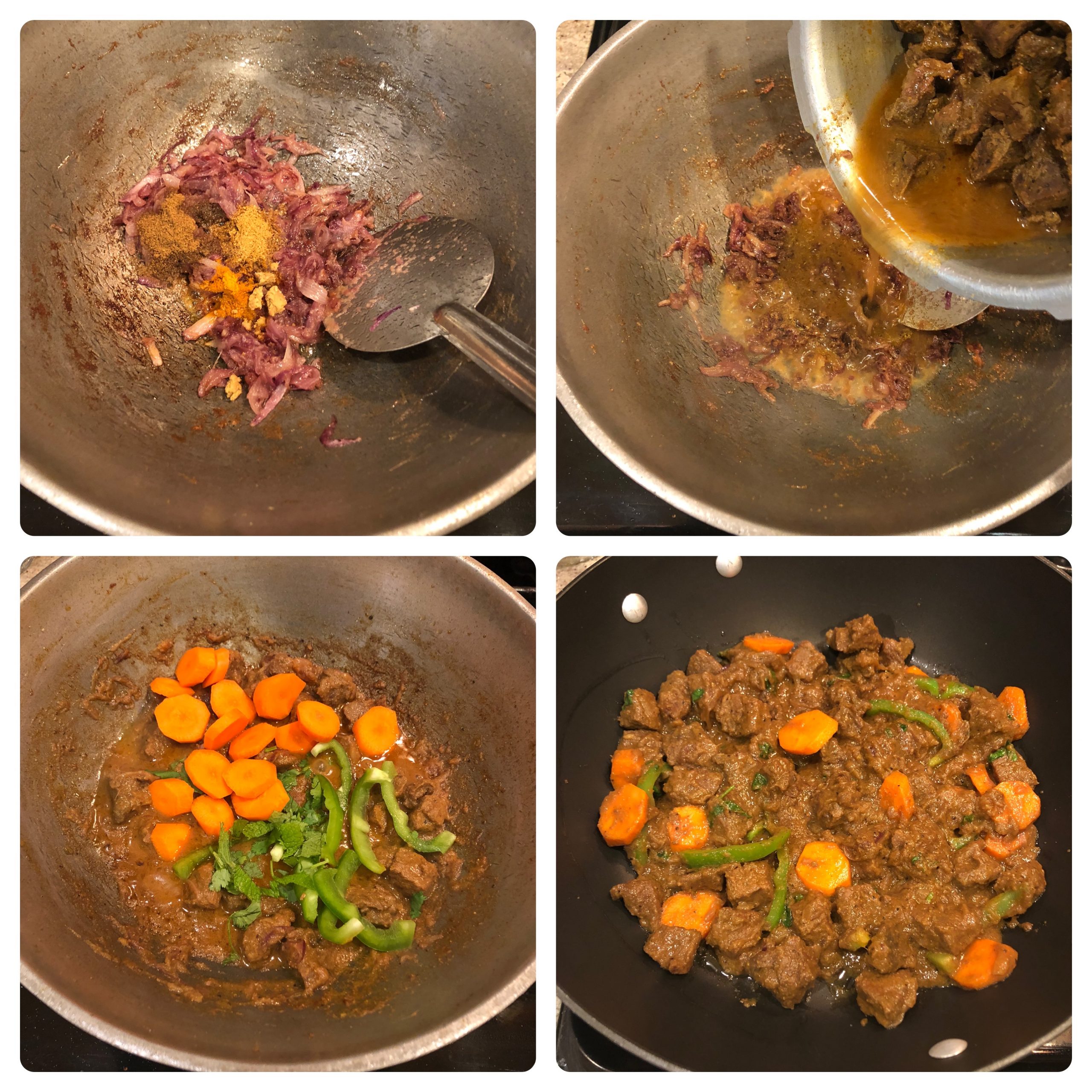 2. Heat 2 – 3 tbsp oil in a pan. Add onion, little salt and saute till transparent. Add ginger-garlic paste and cook till golden. Add turmeric powder, coriander powder and kabsa masala. Cook for a minute on low heat. Add beef pieces along with gravy. Mix well and cook covered for a few minutes until thick. Add sliced capsicum and carrot pieces. Mix well. Cook covered for two minutes. Switch off. Add chopped coriander leaves and 1 tsp lemon juice. Mix well and set aside.