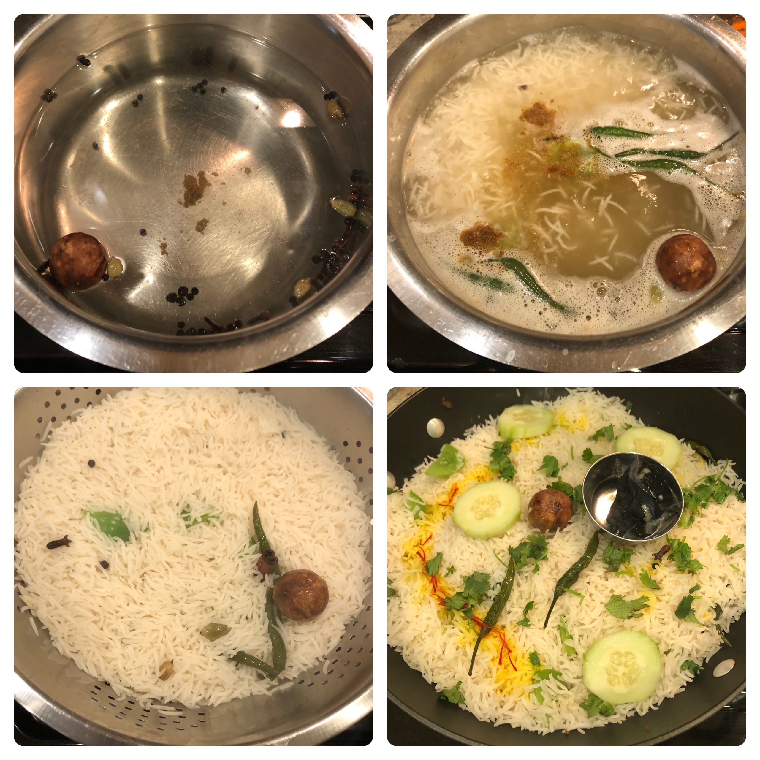 3. . Meanwhile boil water in a vessel adding ingredients numbered 9. Taste-check for salt. The water should be slightly salty. Add drained rice. Cook till rice is 75 % done. When the rice is almost ready to be drained, add 1/2 tsp kabsa masala, 2 tbsp chopped coriander leaves, juice of 1 lemon, few pieces of cubed capsicum and 4 – 5 green chilies. Cook for 1 -2 minutes. Drain well.