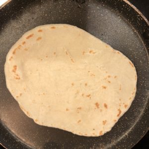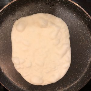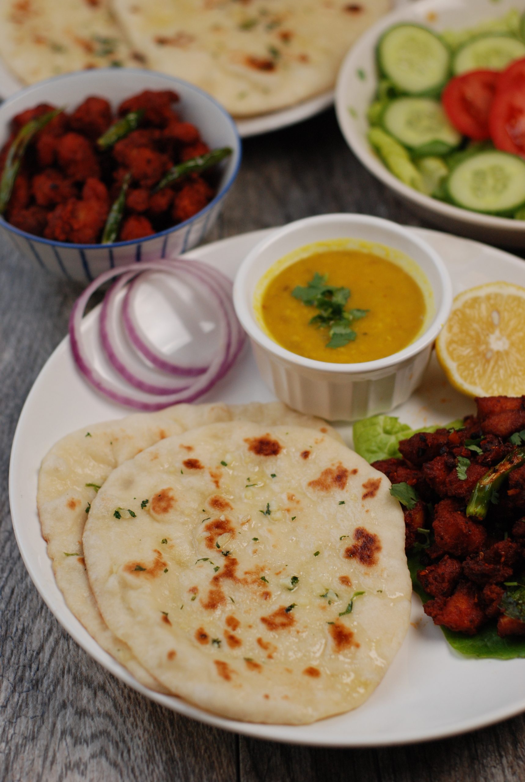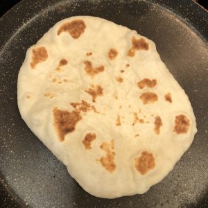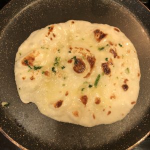 7) Heat a skillet over high heat. Once hot, reduce to medium-high flame. Place a rolled flatbread on top and cook for 30 – 45 seconds on one side or until bubbles appear on the surface. Flip over to the other side and cook for 1 -2 minutes over high heat till it starts puffing up and bottom has brown spots and blisters. Flip, cook 1 more minute over medium or medium high flame, and flip back onto original side. Bring down the heat to low. Add 2 – 3 tsp of garlic butter mix and spread on the naan. For plain naan – Brush naan with butter once done. Remove to a plate and cover immediately with an aluminium foil or clean towel to prevent drying out. Continue the process until all the naans are done. Serve immediately or keep covered until ready to serve. Serve warm with butter chicken, grilled chicken, dal, paneer etc.