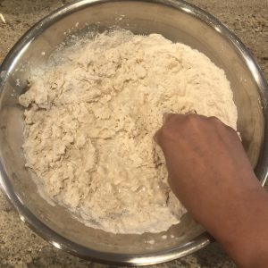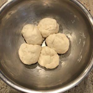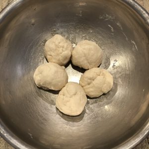 5) Once the dough is doubled, punch down the dough and divide into 5 – 7 equal sized balls. Cover with a towel or plastic wrap and set aside in a warm place for 10 – 15 minutes.
