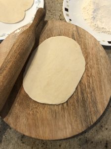 6) Working with one dough ball at a time (leave the others covered), roll into an oval shape (just like you would do for chapathis, but thicker..be sure to flour the surface to avoid sticking.).