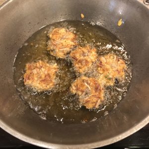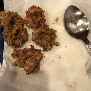 4. Heat oil for deep-frying over medium-high heat. Drop spoonfuls of the batter in the oil OR Dip you fingers in water (placed in a bowl) and scoop a little batter . Make a hole in the middle (just as you would for medu / uzhunnu vada). Drop gently into the oil. Fry over medium heat on both sides, for 8 – 10 minutes till crispy and browned. Serve hot with chutney / ketchup.