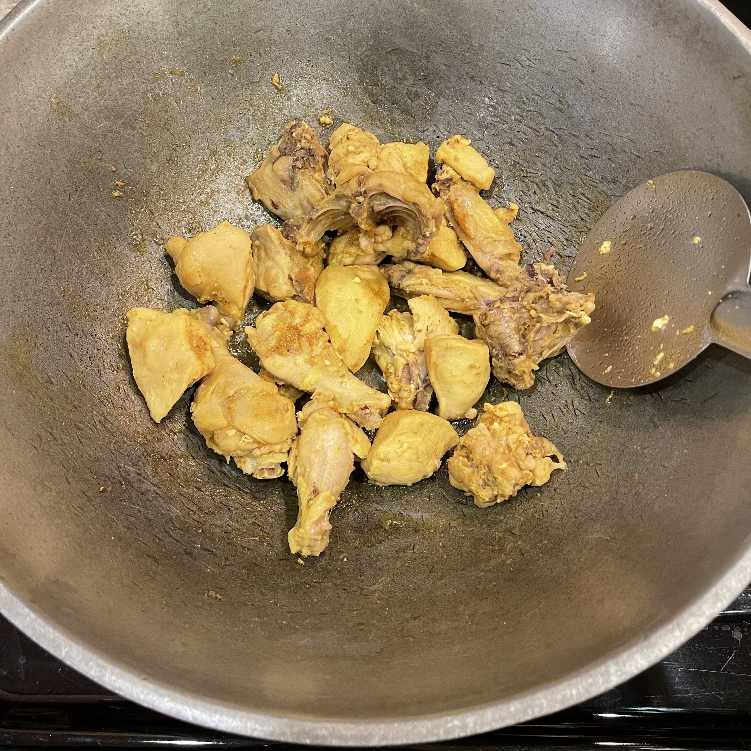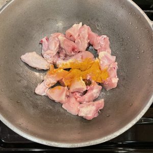 - In a cheena chatti/wok, add chicken pieces, turmeric powder, salt, 2 tbsp water and 1 tsp coconut oil. Cook covered for 15 minutes, stirring occasionally till done and water is completely evaporated.