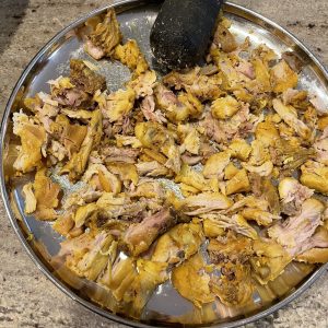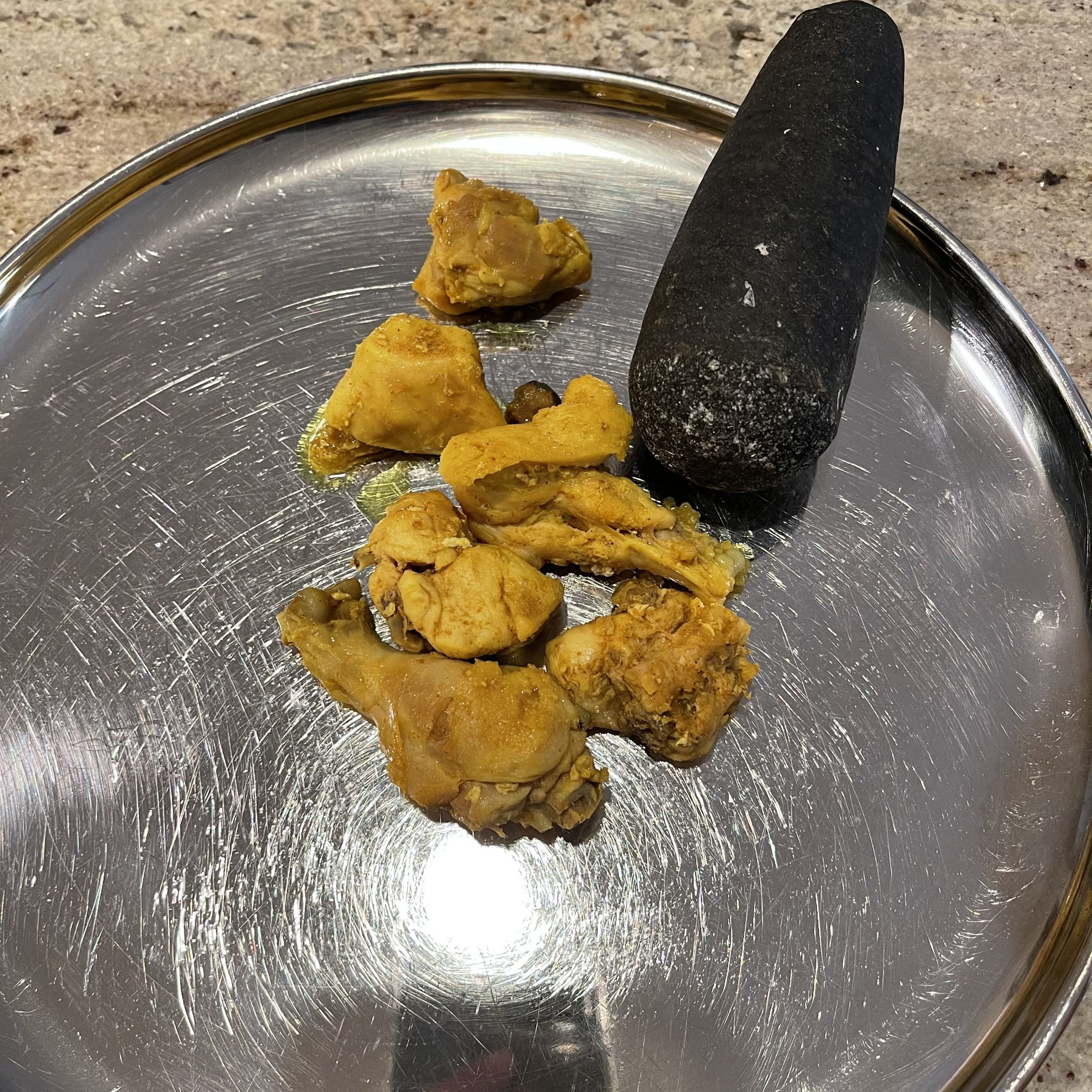 2. Pound the chicken pieces using a pestle, as shown in the pic below (chicken chathachu edukkuka).