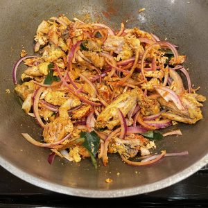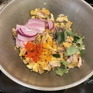 3.Combine the crushed chicken pieces with onion, lemon juice, chili powder, pepper powder and curry leaves.