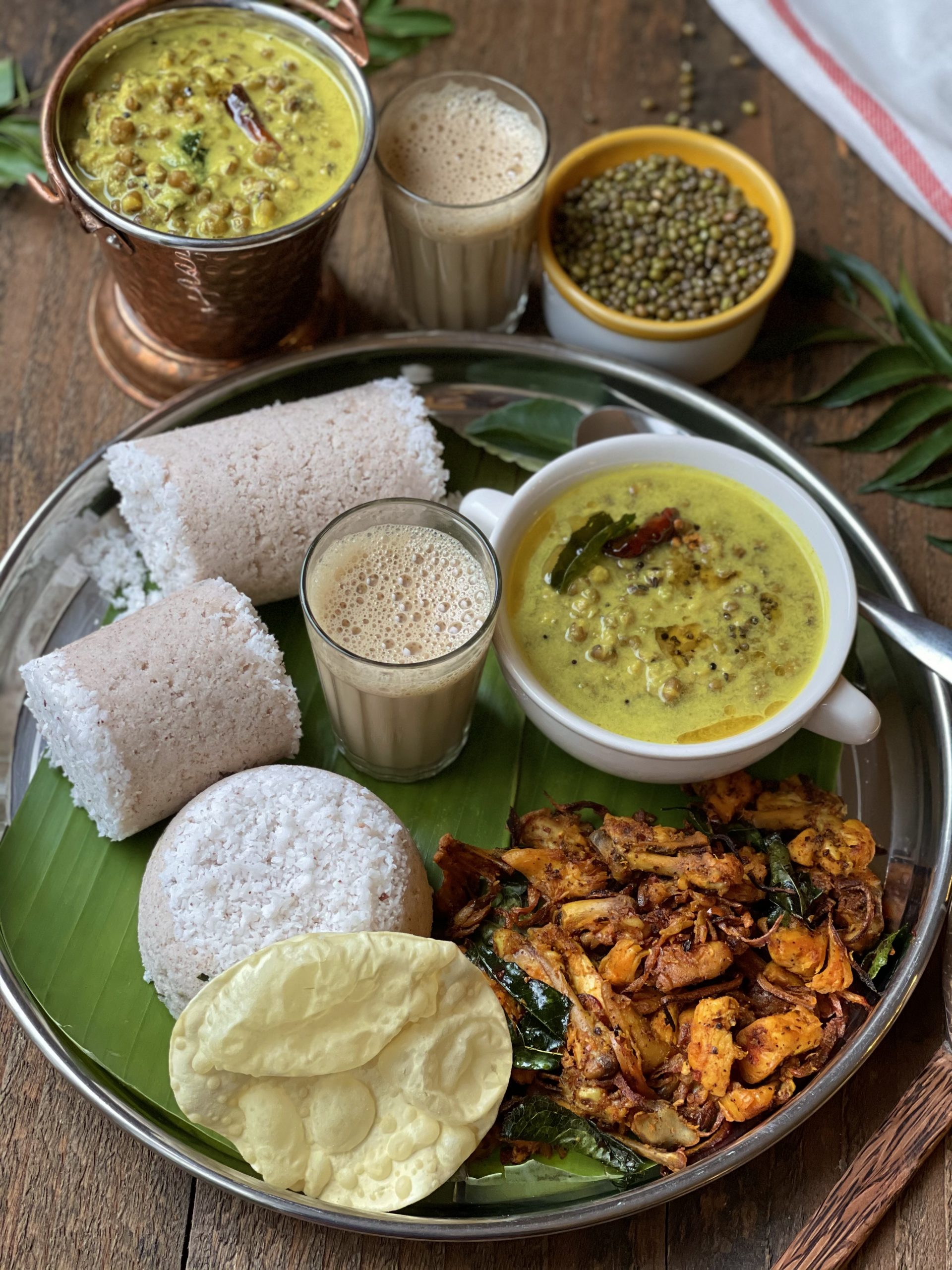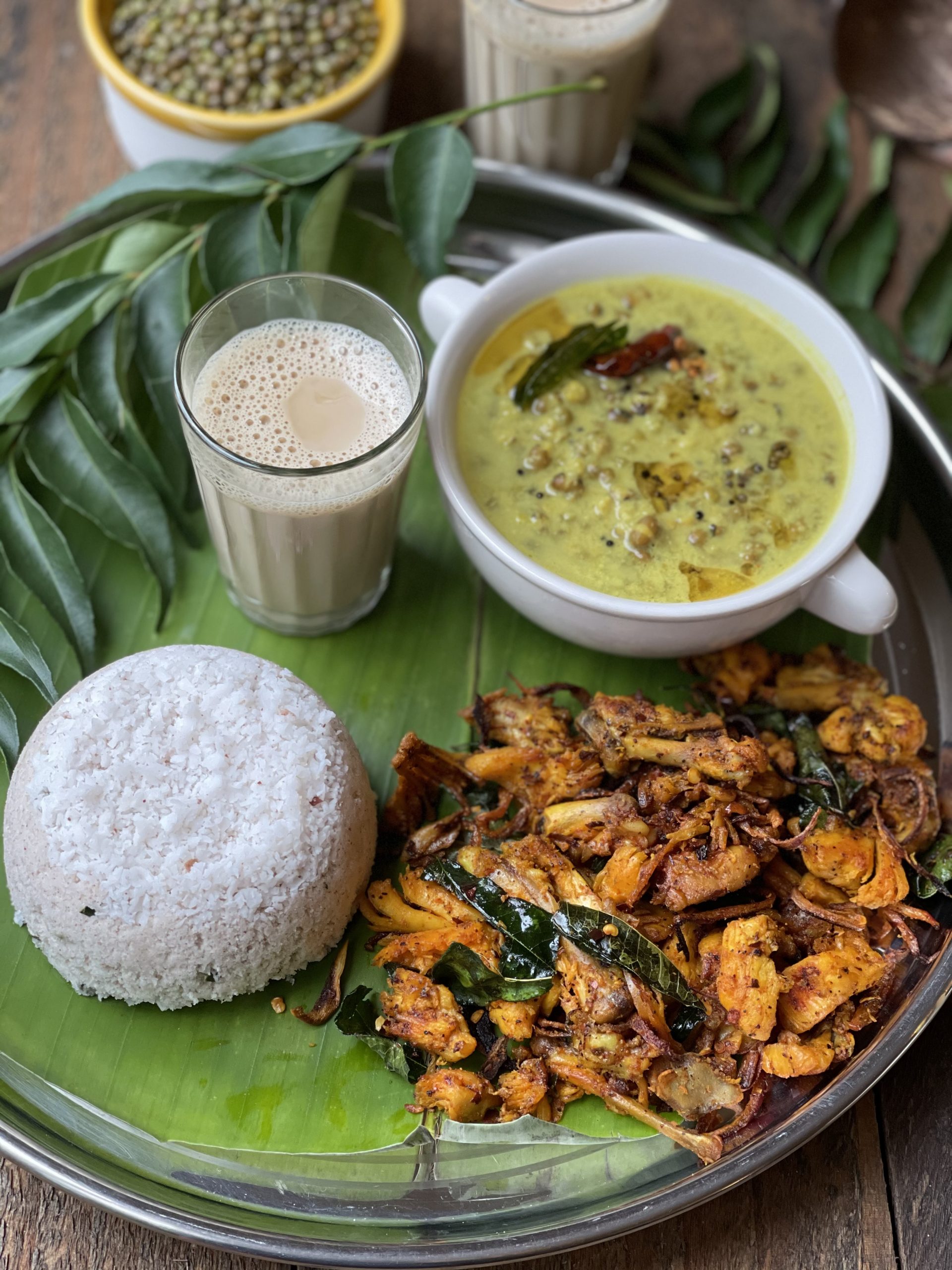 Puttu, green gram curry, pappadam and chicken chathachu porichathu..Came across this combo while scrolling through YouTube last week and gave it a try the next day itself. As I guessed, the combo was really yum. It is the specialty of a thattukada (Kanthari) based in Kozhikode. This chicken dish is really easy to make and tastes really good and it goes well with rice and chapathi too..