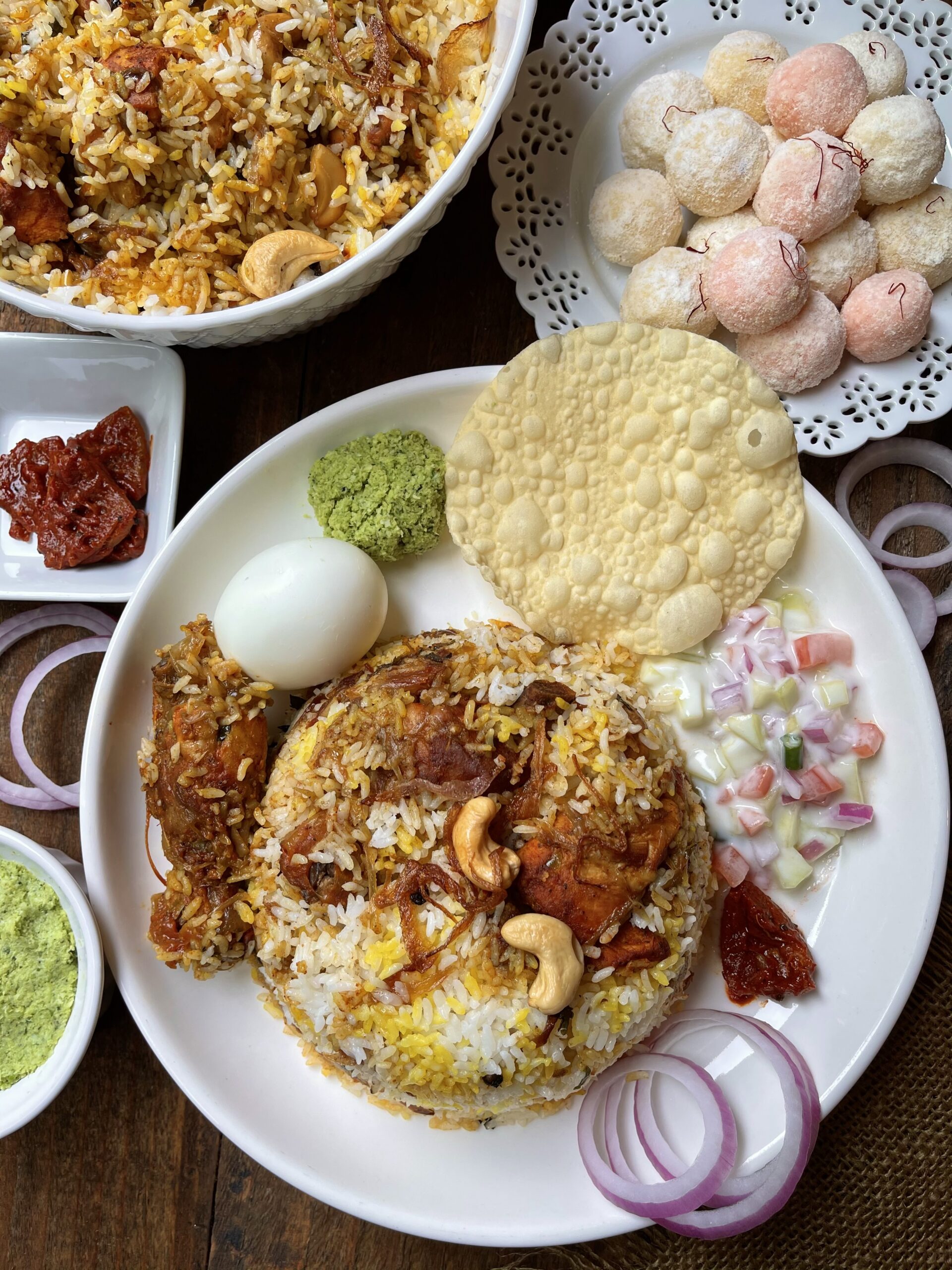 7. To layer –  In a heavy-bottomed vessel (you can use the one in which you cooked chicken if it is oven-proof), spread chicken masala at the bottom. Top it with the hot cooked ghee rice. Sprinkle fried onion, cashews, raisins, chopped mint, cilantro, a pinch of garam masala powder, ghee and saffron milk. Cover tightly with aluminium foil. Bake at 350 F for 15 minutes. OR Heat a large tawa over high heat. Bring down the heat to medium. Place the biriyani pot and cook for 3 – 4 minutes on medium heat and 8 – 10 minutes on the lowest heat possible. Switch off. Let it rest unopened for another 10 – 15 minutes in the biriyani pot. Mix gently. Let rest for 10 minutes. Serve hot with raita, biriyani chammanthi, pappadam and date-lemon pickle.